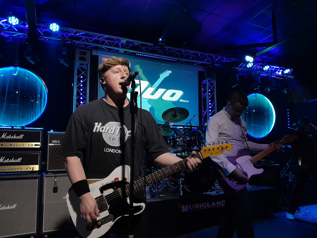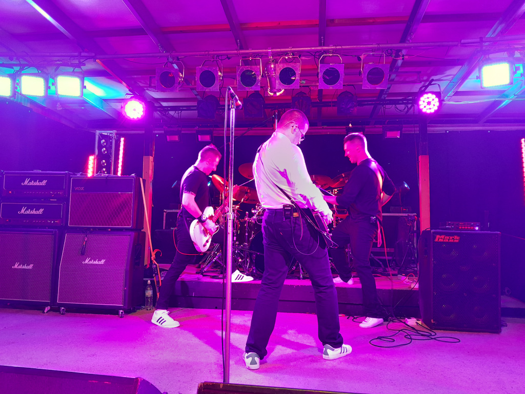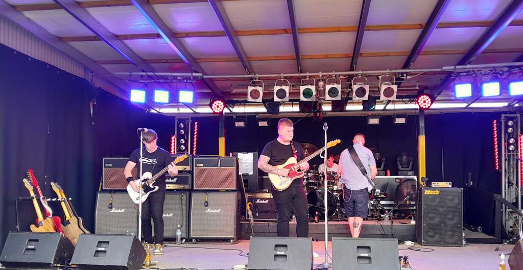 Next up were local band, Darkcide, playing together with this line-up for the first time in decades. They played a heavy set of their own songs plus rock covers. "It's a Long Way to the Top (If You Wanna Rock 'n' Roll)" saw a professional bagpiper join them on stage and he also went on to play "Scotland The Brave", much to the delight of the Quo Story lads who watched on respectfully from the side of the stage. (The full Darkcide set can be watched here.)